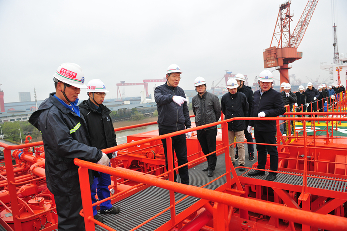 副董事長(zhǎng)王建生、副總經(jīng)理杜成忠以及生產(chǎn)管理部負(fù)責(zé)人陪同江南造船調(diào)研組一行,分別參觀(guān)了揚(yáng)子鑫福和新?lián)P子造船生產(chǎn)現(xiàn)場(chǎng)并登船參觀(guān)。在參觀(guān)新?lián)P子建造的83500DWT化學(xué)品組合船時(shí),林董事長(zhǎng)對(duì)這種集油、散貨、化學(xué)制品三者兼裝,能為船東提供靈活機(jī)動(dòng)營(yíng)運(yùn)策略特種船型的設(shè)計(jì)理念,給予了高度評(píng)價(jià)。