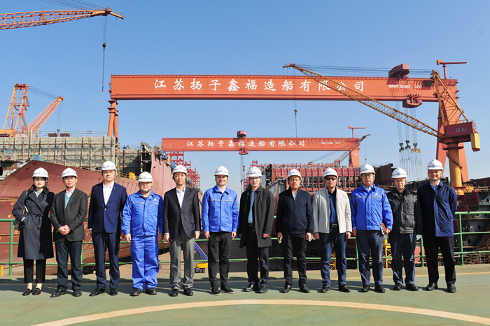 董事長(zhǎng)任樂(lè)天、副總經(jīng)理張濤陪同胡賢甫總經(jīng)理一行參觀了揚(yáng)子鑫福造船生產(chǎn)現(xiàn)場(chǎng),任董詳細(xì)介紹了揚(yáng)子江船業(yè)的發(fā)展歷程和當(dāng)前的經(jīng)營(yíng)形勢(shì)。登上揚(yáng)子鑫福塢門,揚(yáng)子鑫福總經(jīng)理?xiàng)钛檎猩叹止I(yè)一行領(lǐng)導(dǎo)介紹了塢內(nèi)在建船舶的基本情況和建造進(jìn)度。