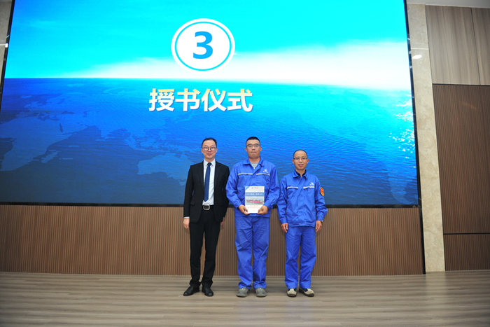 本期特訓(xùn)營的產(chǎn)出已匯編成冊,百仕瑞高級講師顧晨毅老師、新?lián)P子造船副總經(jīng)理倪榮對新?lián)P子機電車間電工四班班長陳亮進(jìn)行了授書儀式,隨后陳亮介紹了手冊內(nèi)容及意義。