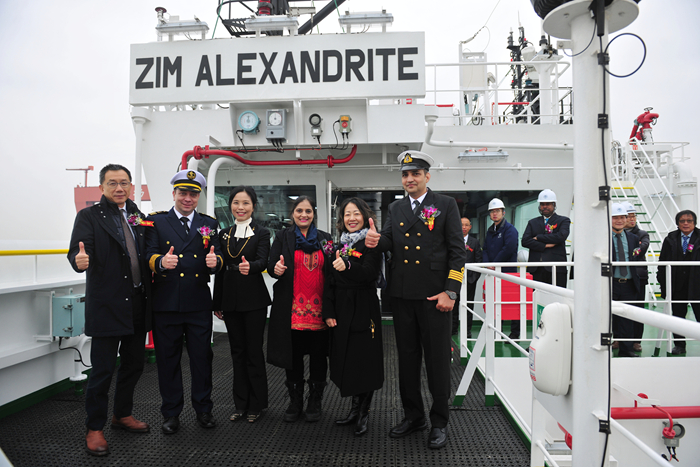 Tracy Hui女士將新船命名為“ZIM ALEXANDRITE”輪,為新船砍纜、擲香檳禮并與嘉賓們登船參觀。汽笛鳴響,祝福新船以及隨船船員航行平安,為船東和租家?guī)順s譽和財富。