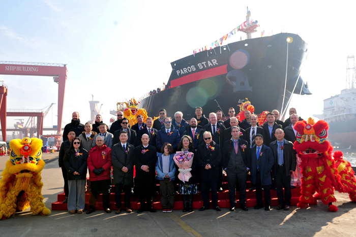 1月9日上午,我集團與船東CHARTWORLD共同為本船舉行了隆重的命名儀式。命名人Eleni Katsari女士,CHARTWORLD船東代表Stefanos Kollakis先生,CHARTWORLD公司執(zhí)行董事Antonis Faraklas先生,英國勞氏船級社(LR)全球審圖中心總裁李天翔先生,衛(wèi)獅集團商務總監(jiān)Jamas Muir先生,我集團副總經(jīng)理兼新?lián)P子造船總經(jīng)理杜成忠先生以及相關合作方代表等領導和嘉賓出席了儀式。Eleni Katsari女士將新船命名為“PAROS STAR”輪,為新船砍纜、擲香檳禮、拉響汽笛。大家祝福這艘承載著夢想與希望的巨輪,在未來的航程中乘風破浪、一帆風順,為船東、租家?guī)碓丛床粩嗟臋C遇與財富!