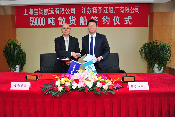 ▲11月13日下午,我集團下屬江蘇揚子江船廠有限公司與上海寶鋼航運有限公司簽署了2艘59000噸散貨船新造船合同。集團董事長任樂天先生,寶鋼資源(國際)有限公司董事長張典波先生,寶鋼資源(國際)有限公司總裁陸克從先生,我集團副總經(jīng)理宋書明先生,副總經(jīng)理杜成忠先生,以及來自寶鋼資源、寶武原料、寶鋼航運、中聯(lián)海運、上海船舶研究設(shè)計院、中國船級社等領(lǐng)導(dǎo)和重要嘉賓出席簽約儀式。
