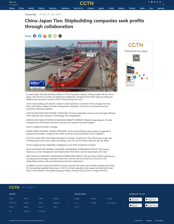 二十國(guó)集團(tuán)(G20)領(lǐng)導(dǎo)人峰會(huì)將于本月28日至29日在日本大阪舉行,峰會(huì)發(fā)布八大主題,經(jīng)貿(mào)仍唱主角。當(dāng)前全球經(jīng)濟(jì)增長(zhǎng)乏力,根據(jù)世界貿(mào)易組織、聯(lián)合國(guó)等多邊組織發(fā)布的相關(guān)報(bào)告,全球經(jīng)濟(jì)在貿(mào)易、投資等方面都缺乏動(dòng)力。在此背景下,CGTN(中國(guó)國(guó)際電視臺(tái))記者鄭亦冰走進(jìn)揚(yáng)子江船業(yè),探尋中日造船企業(yè)通過合作造船,實(shí)現(xiàn)共贏的相關(guān)進(jìn)展。