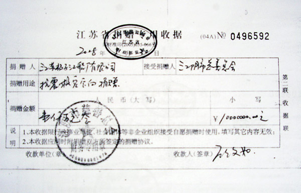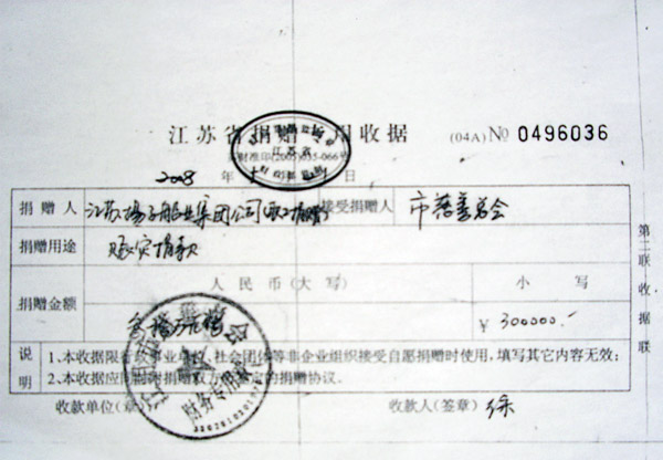 In May, 2008, in order to support the disaster area in Sichuan Province, Group donated about 10 million RMB for building schools, and working staff RMB 300,000.. (Attached donation receipts)
